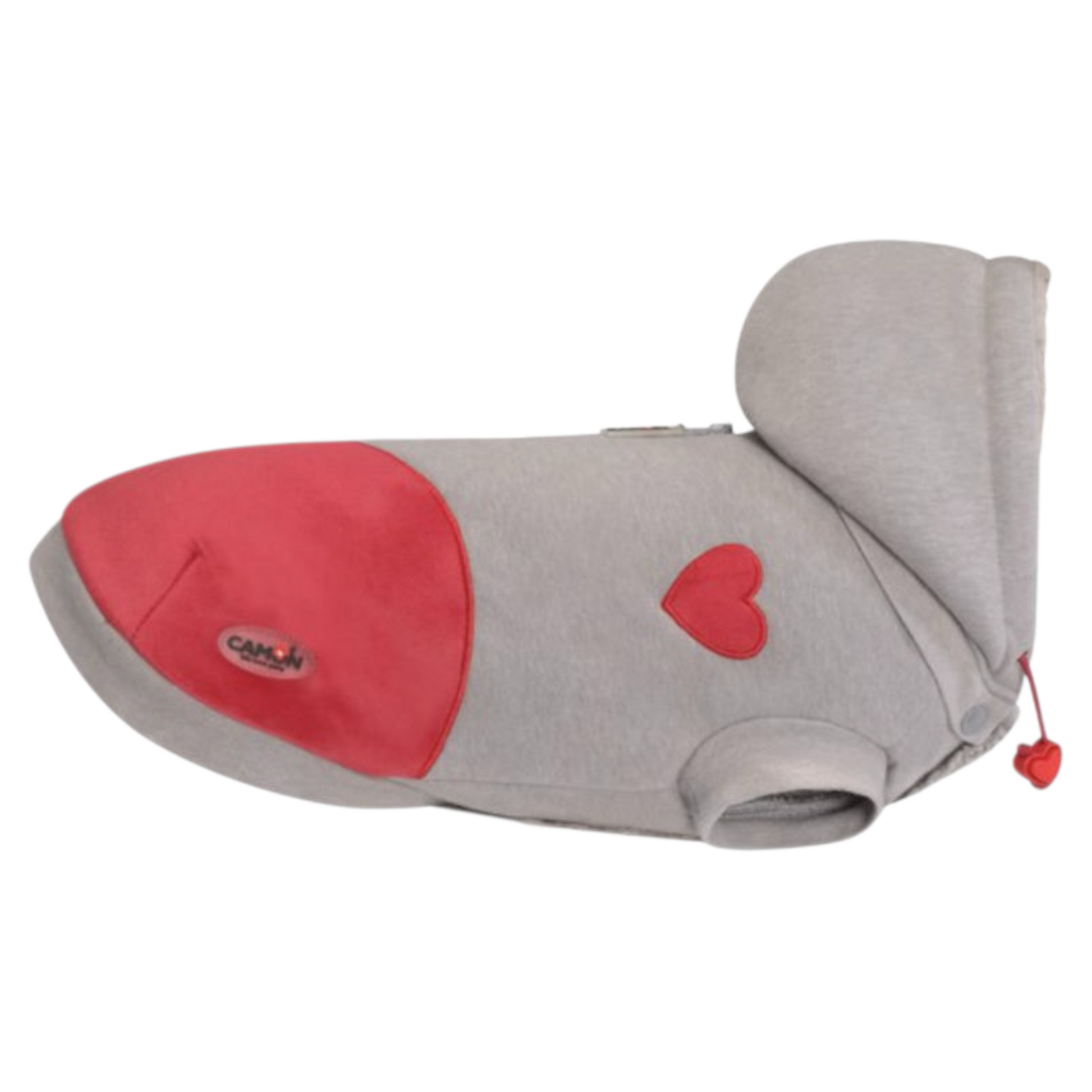 Felpa realizzata con cappuccio staccabile con bottoni a pressione e caldo interno in peluche. Dotata di applicazione a forma di cuore in velluto rosso nella zona posteriore e coulisse con stopper a forma di cuore, apertura a zip per la pettorina ed elastici per le zampe posteriori.
