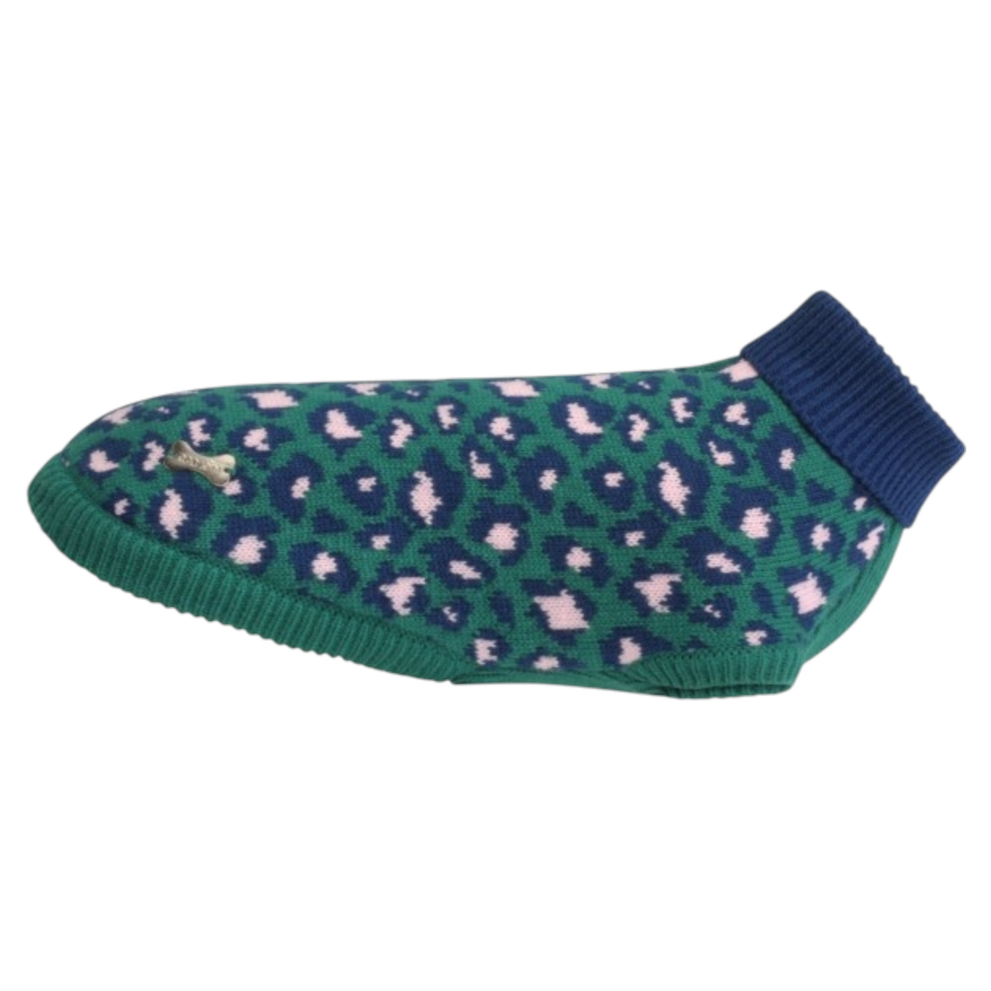 Maglioncino realizzato in filato acrilico con lavorazione jacquard animalier, morbido collo alto risvoltabile a punto coste e apertura per il collare e lacci per le zampe posteriori.