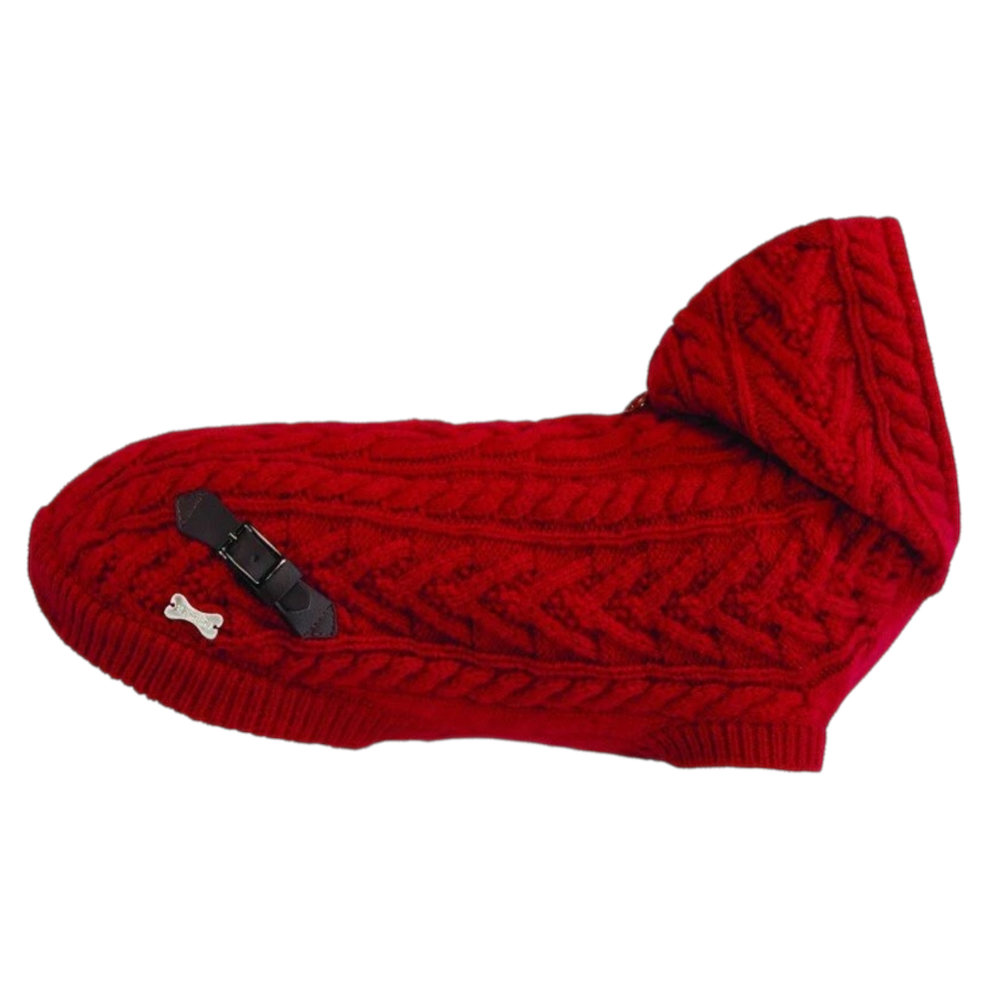 Maglioncino realizzato in filato acrilico con lavorazione a trecce, cappuccio fissabile con bottoncino, morbido girocollo, applicazione di due fibbie sulla schiena e dotato di apertura per il collare e lacci per le zampe posteriori.