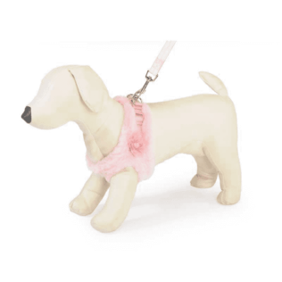 composta da una morbida pettorina traspirante in peluche rosa con applicazioni floreali, accompagnata da un guinzaglio in pratico e resistente nylon.