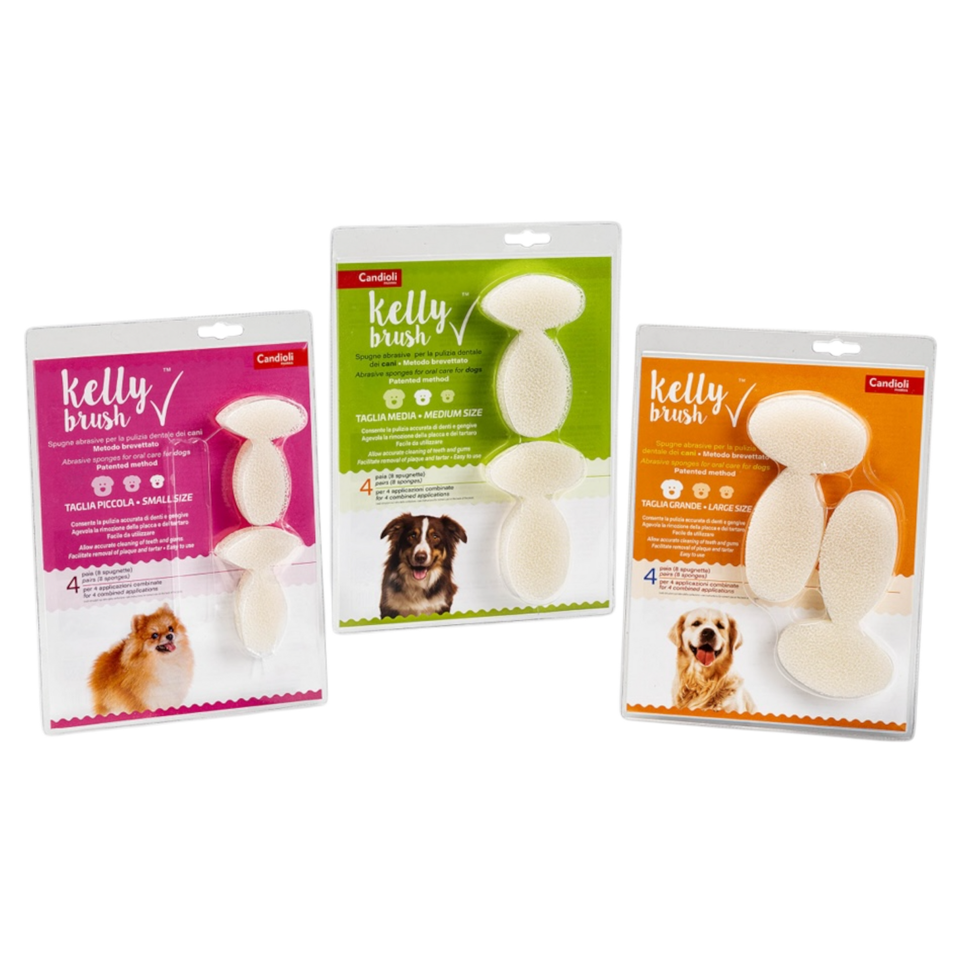 Spugnette abrasive per la pulizia dentale dei cani dalla taglia piccola alla taglia grande.