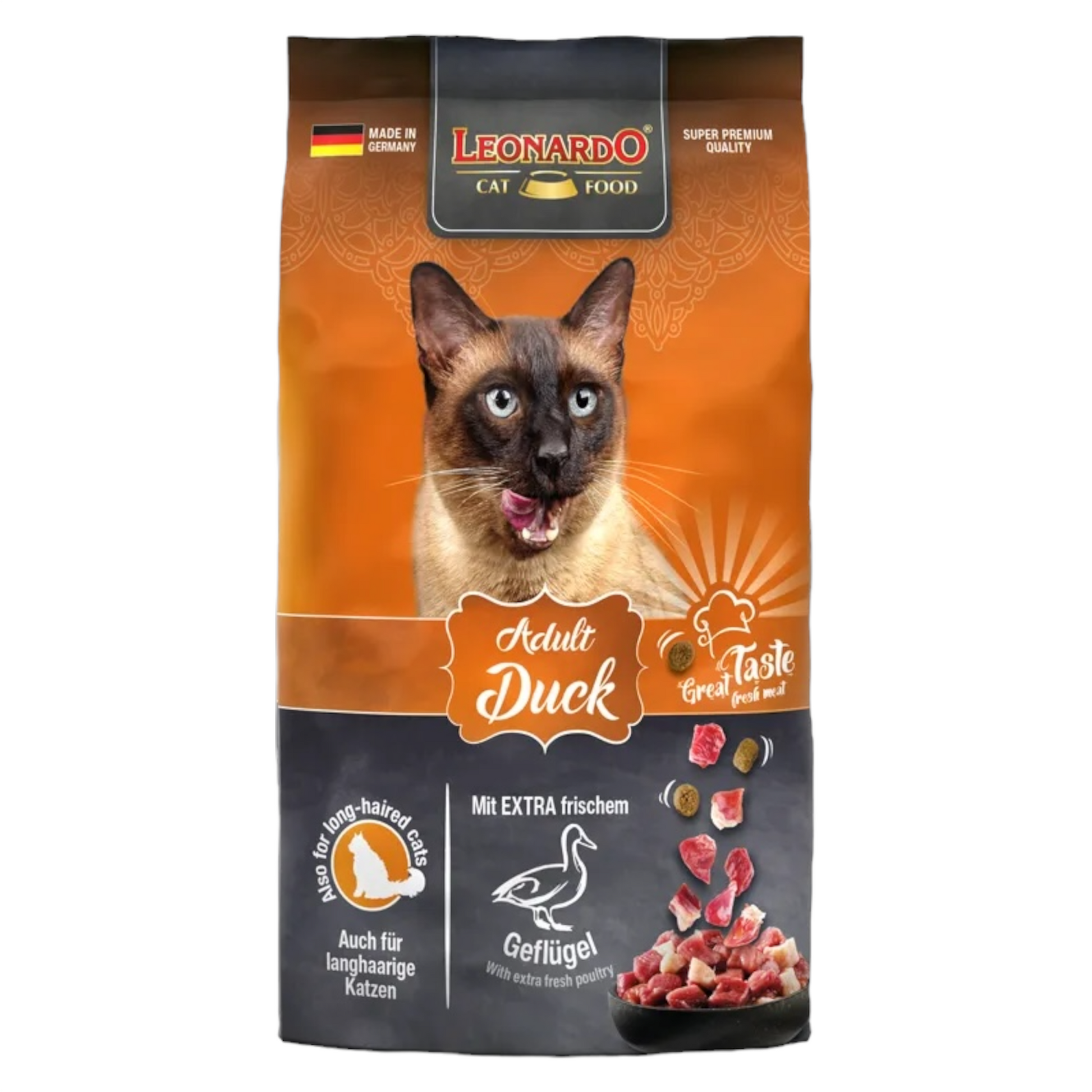 LEONARDO Adult Duck è una variante di gusto prelibata per i gatti che amano il pollame. Inoltre, la ricetta è arricchita con semi di chia e krill delicato, ossia i crostacei provenienti dall'Oceano Antartico. Il loro elevato tenore di acidi grassi Omega-3, unitamente alla lecitina, assicura il mantenimento di una pelle sana e di un pelo lucente.