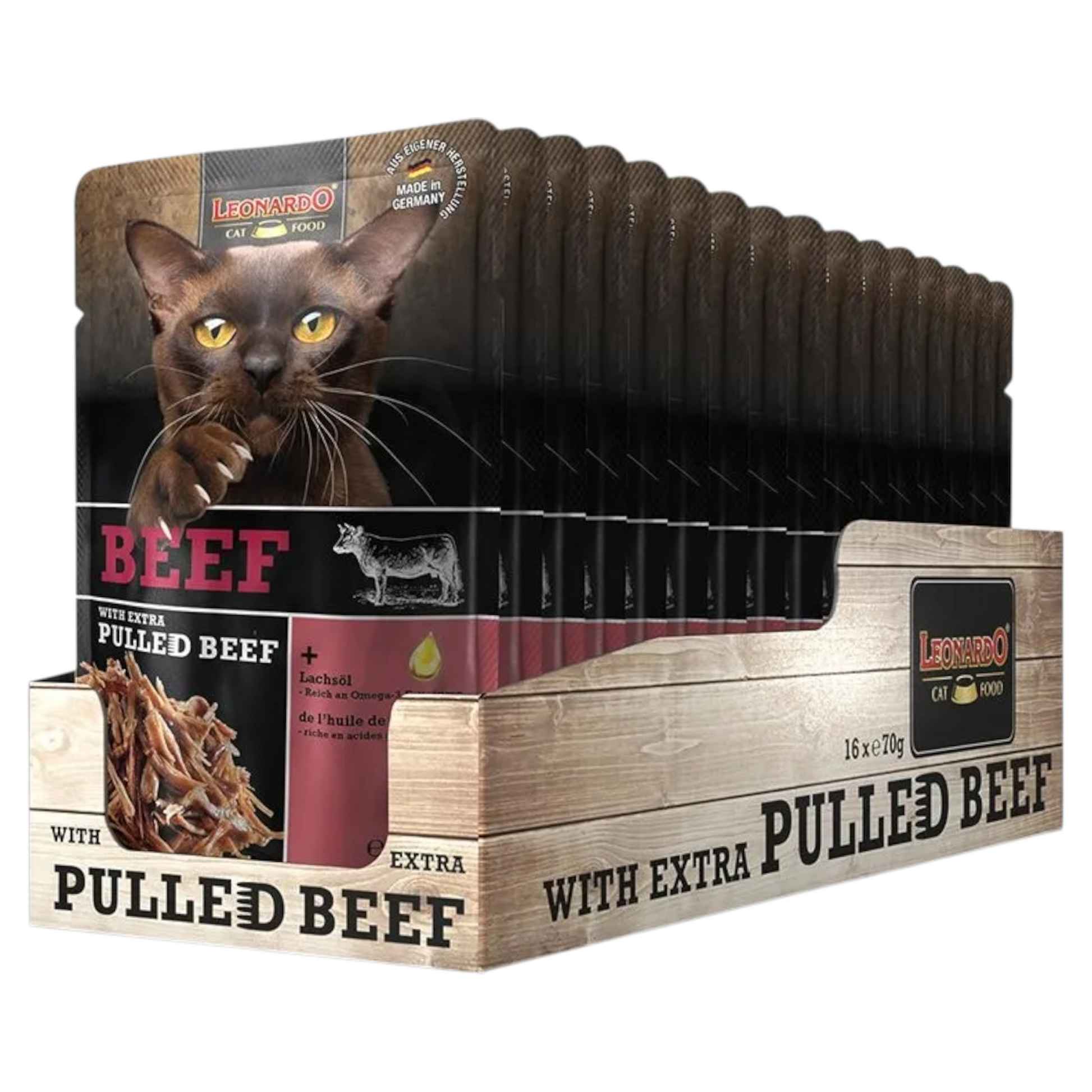 Beef + extra pulled Beef è un succoso paté di manzo con straccetti di carne di manzo Che si tratti di un barbecue con straccetti di carne o di un hamburger con pulled beef in un locale l’esperienza di gusto e il sapore straordinario degli straccetti restano impressi. Adesso con „LEONARDO Pulled Beef“ anche i gatti potranno godere di questo piacere. Ogni porzione viene cotta delicatamente e raffinata con olio di salmone. L’olio di salmone fornisce acidi grassi polinsaturi per un mantello particolarmente setoso.