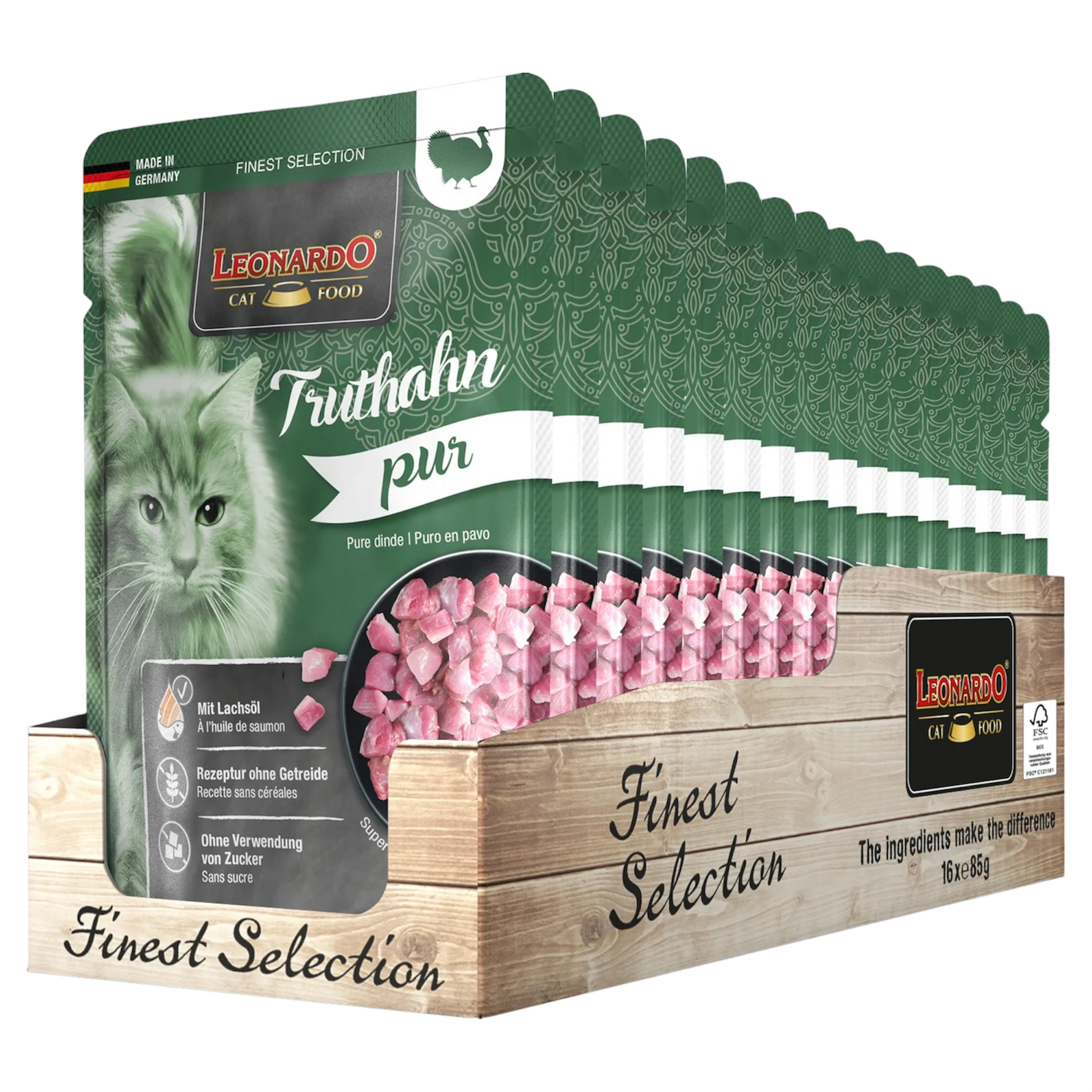 Massimo mini-pasto: gusto che si concentra sull’essenziale. Con il tacchino magro, LEONARDO Tacchino Puro porta nella ciotola una leccornia particolarmente digeribile, che aumenta il benessere grazie ai preziosi minerali e agli acidi grassi polinsaturi dell’olio di salmone e fa risplendere il pelo.
