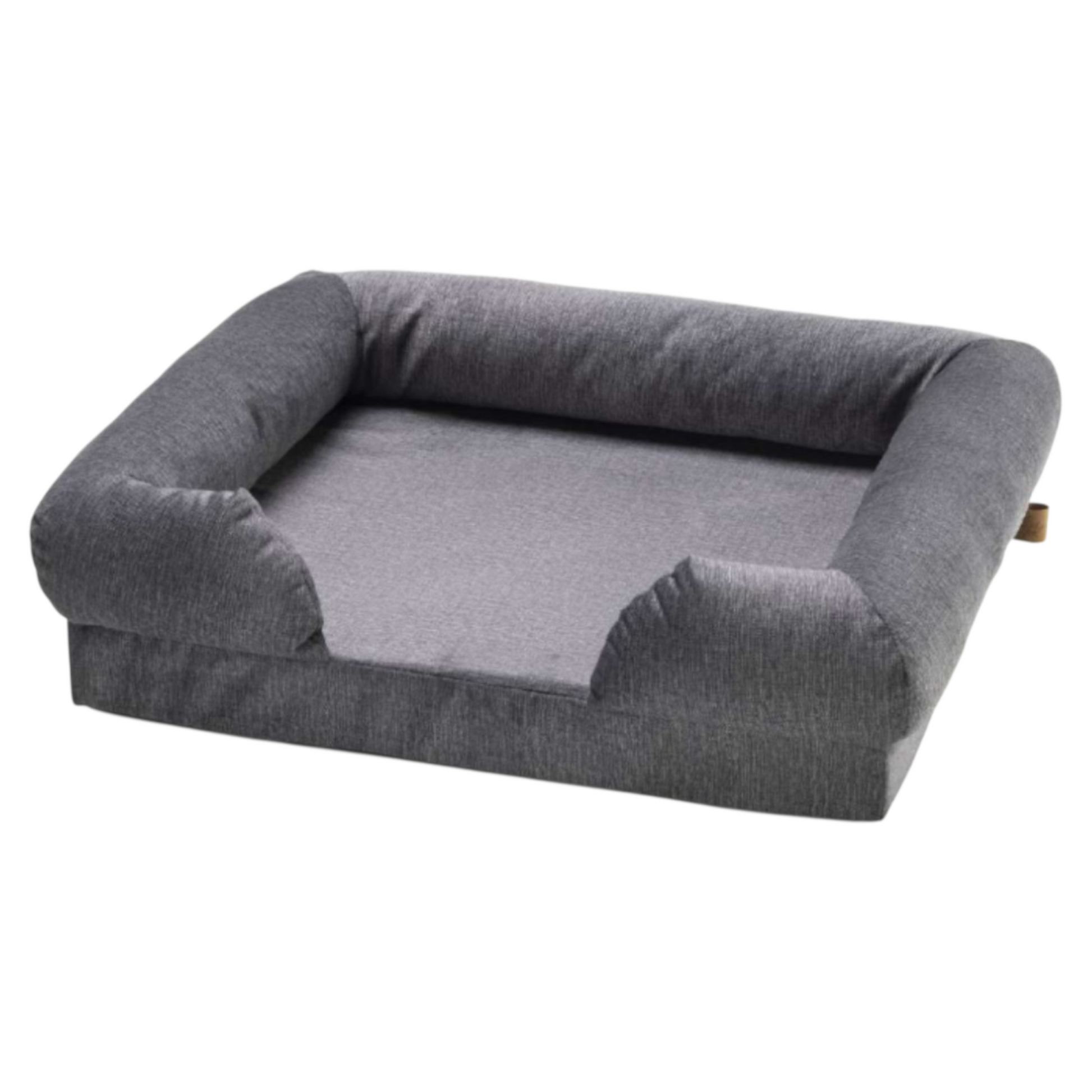 Cuccia rettangolare completamente sfoderabile a forma di divano, in tessuto raffinato grigio e antigraffio. realizzato con interno in gomma piuma (spessore 8 cm), braccioli imbottiti con morbida fibra 100% poliestere e base antisciviolo.