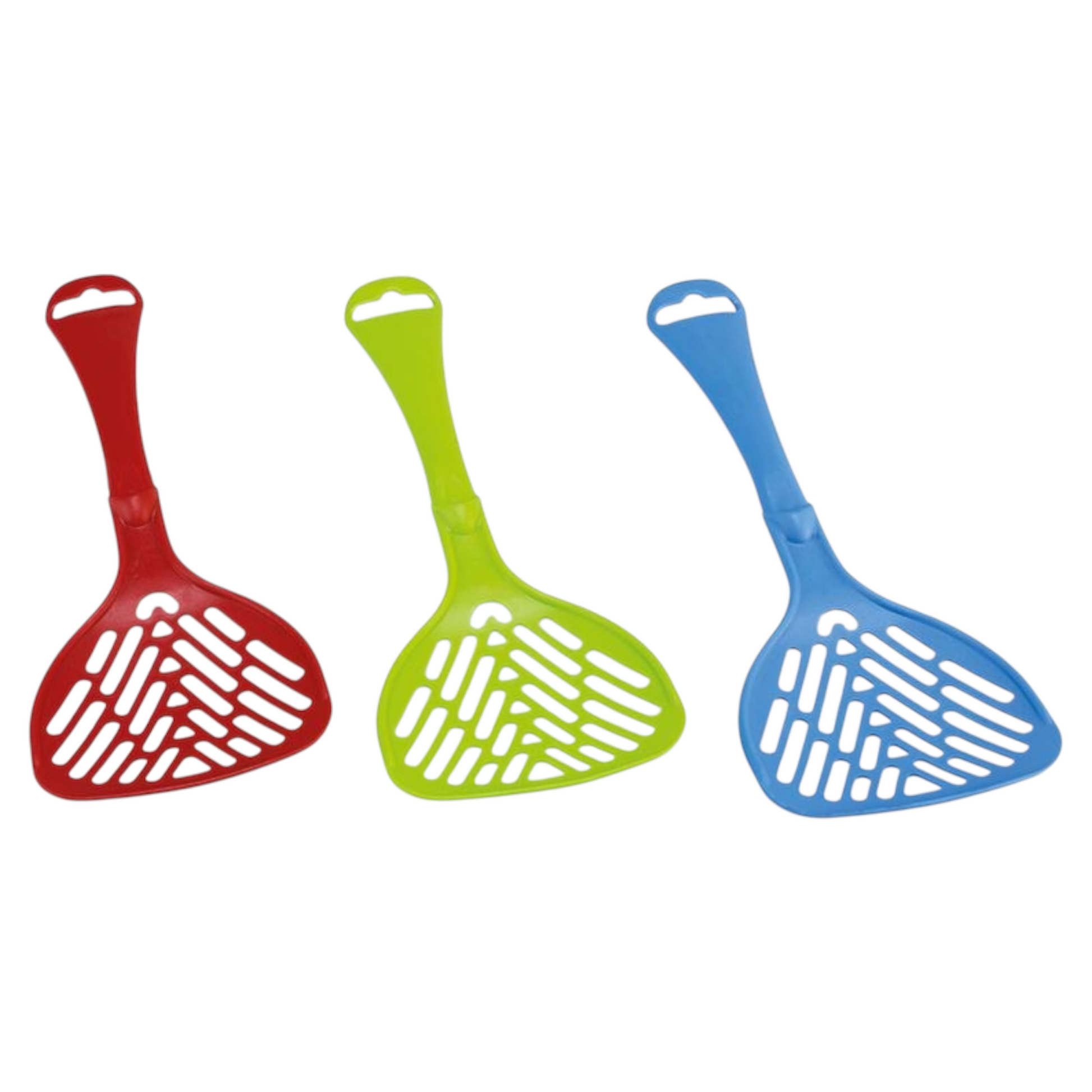 Paletta igienica per lettiera, realizzata interamente in plastica, con fori stretti per una migliore presa e igiene.