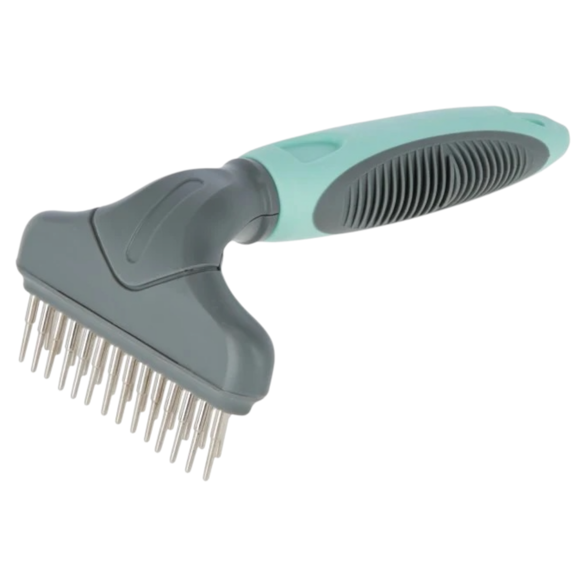 Rastrello a fila singola con denti rotanti per pelo leggermente infeltrito o difficile da pettinare di cani e gatti.