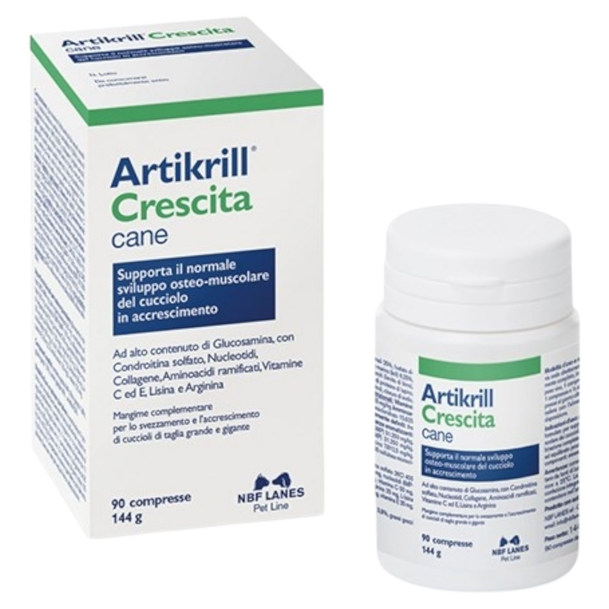 Mangime complementare per lo svezzamento e l’accrescimento di cuccioli di taglia grande e gigante, ad alto contenuto di Glucosamina, con Condroitina solfato, Nucleotidi, Collagene, Aminoacidi ramificati, Vitamine C ed E, Lisina e Arginina, ideato per supportare il normale sviluppo osteo-muscolare del cucciolo in accrescimento.