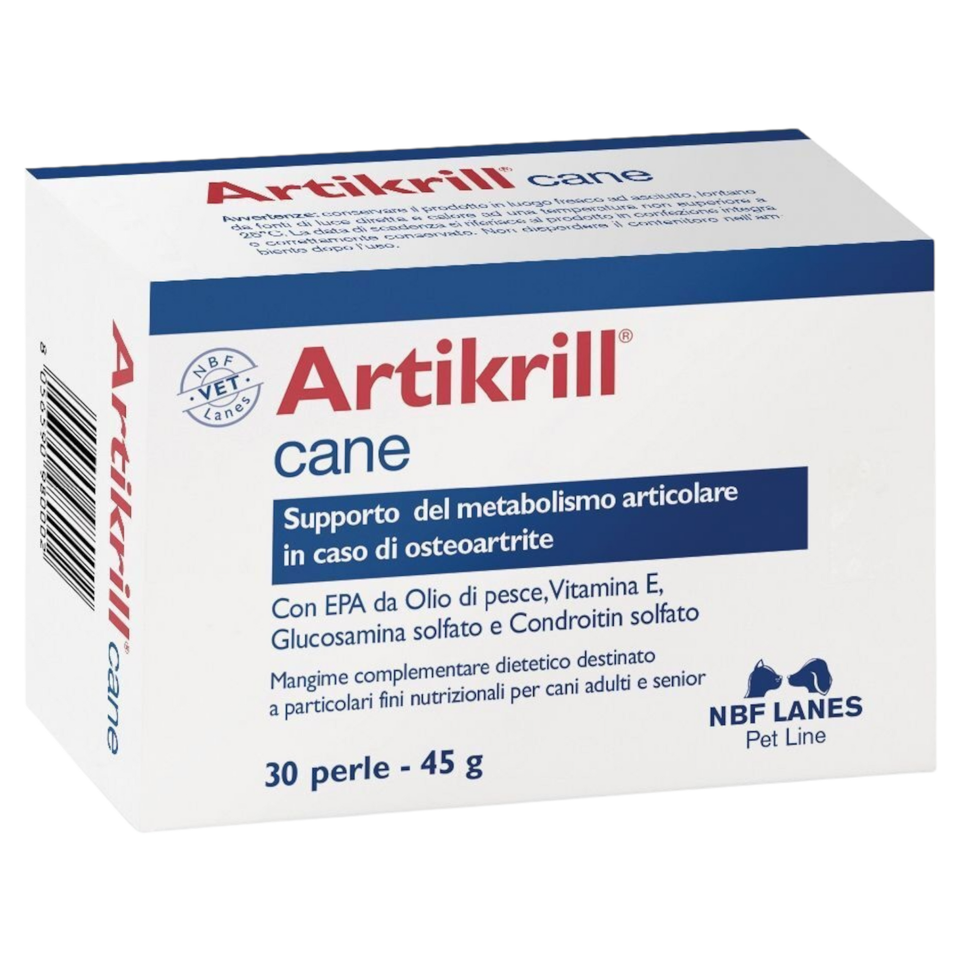 Mangime complementare dietetico per cani adulti e senior, formulato con EPA da olio di pesce, glucosamina solfato, condroitin solfato, e con un livello adeguato di Vitamina E per il supporto al metabolismo articolare in caso di osteoartrite del cane.