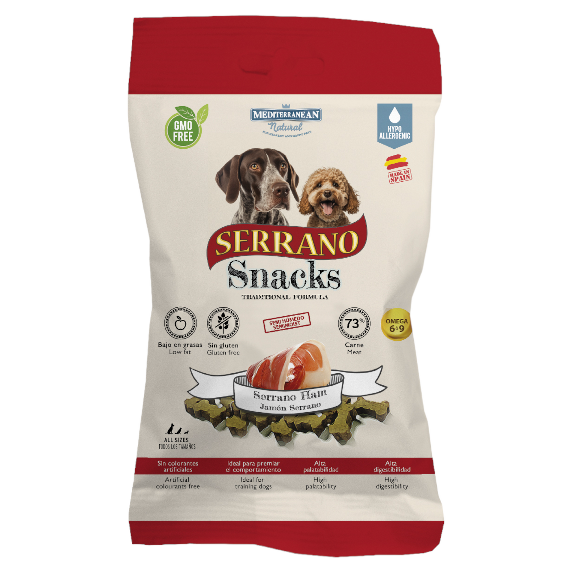 Gli Snack Serrano, a forma di osso, sono ipoallergenici e contengono almeno il 70% di carne. Sono formulati con materie prime prive di glutine, non contengono coloranti artificiali, OGM o acidi grassi trans.
