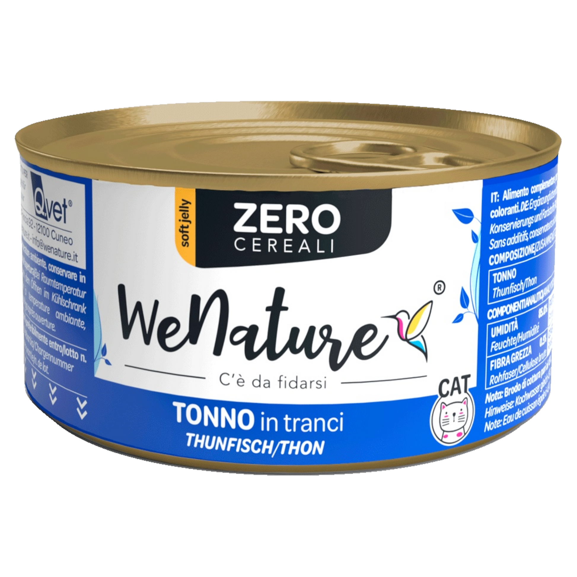 Alimento umido complementare per gatti, fatto a mano in acqua di cottura (pari al 45%), senza cereali, conservanti, coloranti nè aromatizzanti.